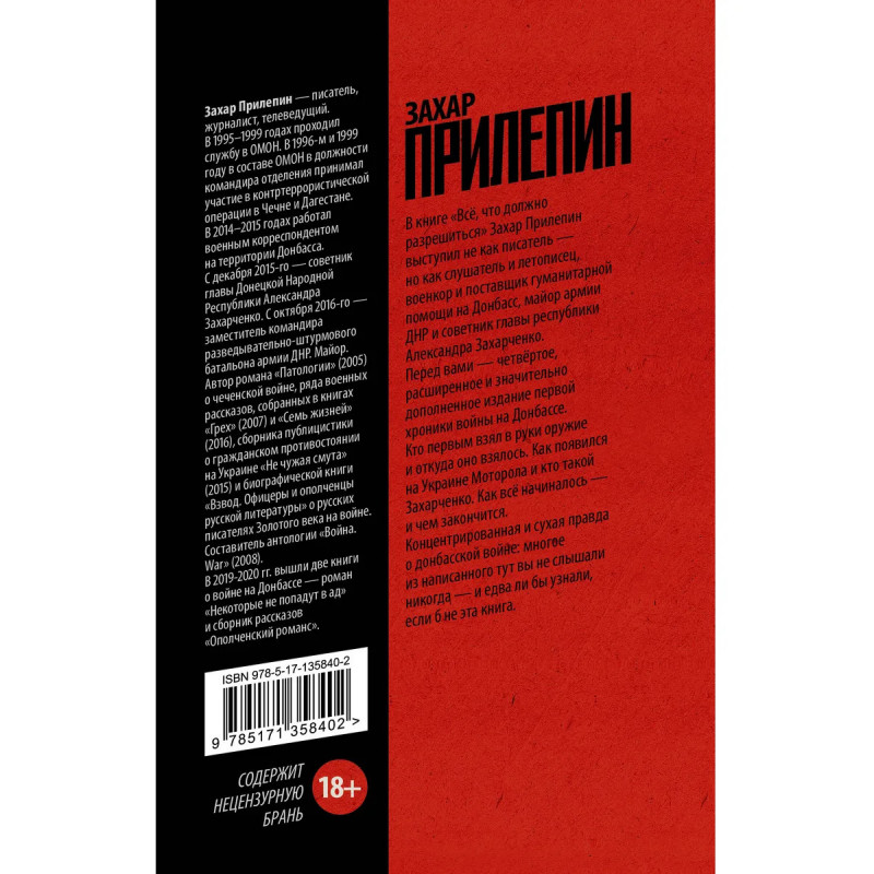 В книге "Всё, что должно разрешиться" Захар Прилепин выступил не как писатель но как слушатель и летописец, военкор и поставщик гуманитарной помощи на Донбасс, майор армии ДНР и советник главы республики Александра Захарченко. Перед вами четвёртое, расширенное и значительно дополненное издание первой хроники войны на Донбассе. Кто первым взял в руки оружие и откуда оно взялось. Как появился на Украине Моторола и кто такой Захарченко. Как всё начиналось и чем закончится. Концентрированная и сухая правда о донбасской войне: многое из написанного тут вы не слышали никогда и едва ли бы узнали, если б не эта книга.