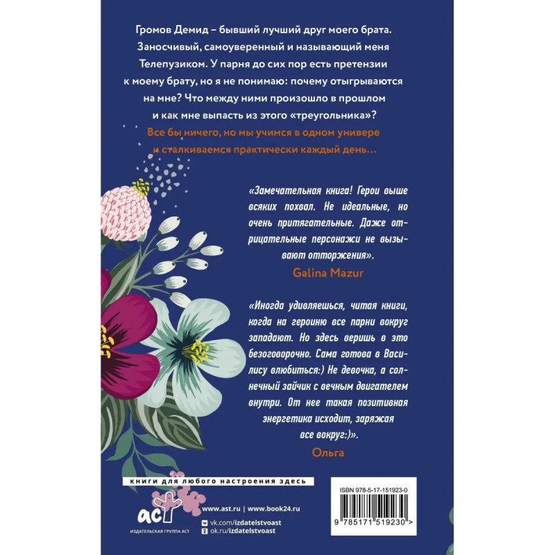 Демид Громов бывший лучший друг моего брата. Заносчивый, самоуверенный и называющий меня Телепузиком. У парня до сих пор есть претензии к моему брату, но я не понимаю, почему отыгрываются на мне? Что между ними произошло в прошлом и как мне выпасть из этого "треугольника"? Все бы ничего, но мы учимся в одном универе и сталкиваемся практически каждый день