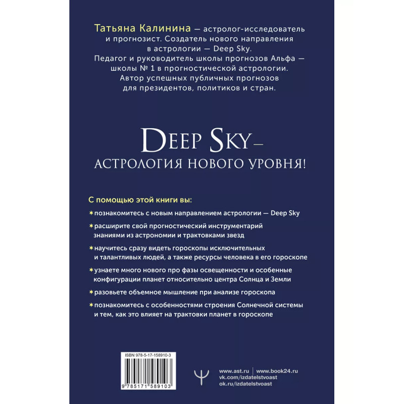 Астрология Deep Sky. Высший уровень в составлении гороскопов. Татьяна Калинина сделала много публичных прогнозов, которые сбылись в подробностях, включая президентство Трампа (216) и Байдена (22), закрытие границ из-за COVID-19 (22), окончание пандемии COVID-19 (222), переворот в Кыргызстане (22), окончание карьеры А. Меркель (221), противостояние Кыргызстана и Таджикистана (222), падение Нетаньяху (222), начало военных действий в Израиле (223) и прочие. Астрология Deep Sky - новое направление в астрологии. Это современные уникальные методики, собранные и усовершенствованные исследователями школы прогнозов Альфа. Deep Sky - это галактики, туманности, звездные скопления и двойные звезды. Они влияют на личный гороскоп человека и страны не меньше, чем планеты. Гороскоп, в котором учтены объекты глубокого космоса, - это точнейший индивидуальный гороскоп, с деталями, которые невозможно увидеть, составляя его обычными методами. Так вы сможете получить максимально точное предсказание событий и понимание ситуации или человека. Татьяна Калинина - астролог-исследователь и прогноз