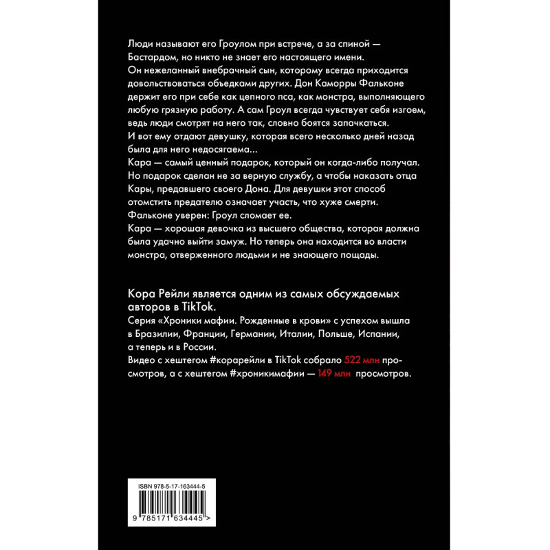 - Новая история из цикла международных бестселлеров «Хроники мафии. Рожденные в крови». Пятый том серии. - Горячие романы о личной жизни итальянских мафиозных кланов: лас-вегасской Каморры, нью-йоркских и чикагских семей — принесли Коре Рейли всемирную славу. - Книги Рейли с успехом издают в Бразилии, Франции, Германии, Италии, Польше, Испании. - У романов серии огромный фэндом: хэштег #корарейли собрал 522 000 000 просмотров в TikTok, хэштег #хроникимафии — 149 000 000 просмотров. - Чувственно, опасно, эротично. Строго 18+.
