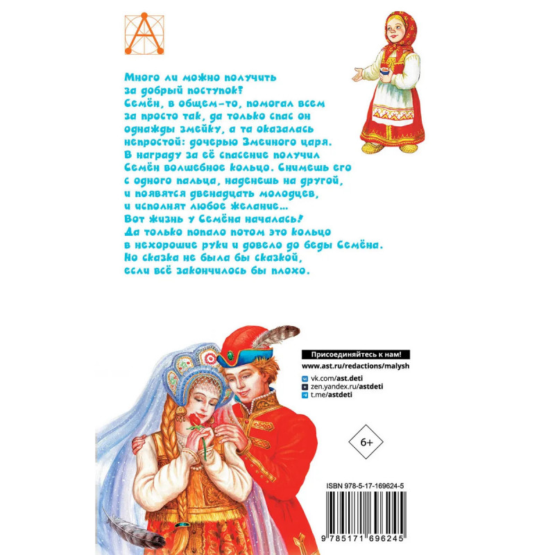 Много ли можно получить за добрый поступок? Семён, в общем-то, помогал всем за просто так, да только спас он однажды змейку, а та оказалась непростой: дочерью Змеиного царя. В награду за её спасение получил Семён волшебное кольцо. Снимешь его с одного пальца, наденешь на другой, и появятся двенадцать молодцев, и исполнят любое желание Вот жизнь у Семёна началась! Да только попало потом это кольцо в нехорошие руки и довело до беды Семёна. Но сказка не была бы сказкой, если всё закончилось бы плохо.