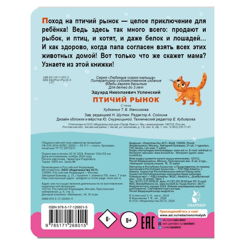 Поход на птичий рынок — целое приключение для ребёнка! Ведь здесь так много всего: продают и рыбок, и птиц, и котят, и даже белок и лошадей… И как здорово, когда папа согласен взять всех этих животных домой! Вот только что же скажет мама? Узнаете из этой книжки! Эдуард Николаевич Успенский - классик отечественной детской литературы. Его стихи и сказки очень нравятся маленьким читателям, ведь они смешные, динамичные и интересные. В этой книге текст дополнен иллюстрациями современной художницы Татьяны Максимовой. Эта книга предназначена именно для малышей: в ней яркие рисунки и крупные буквы, плотный картон не порвется при чтении, а скругленные уголки не повредят маленькие пальчики.