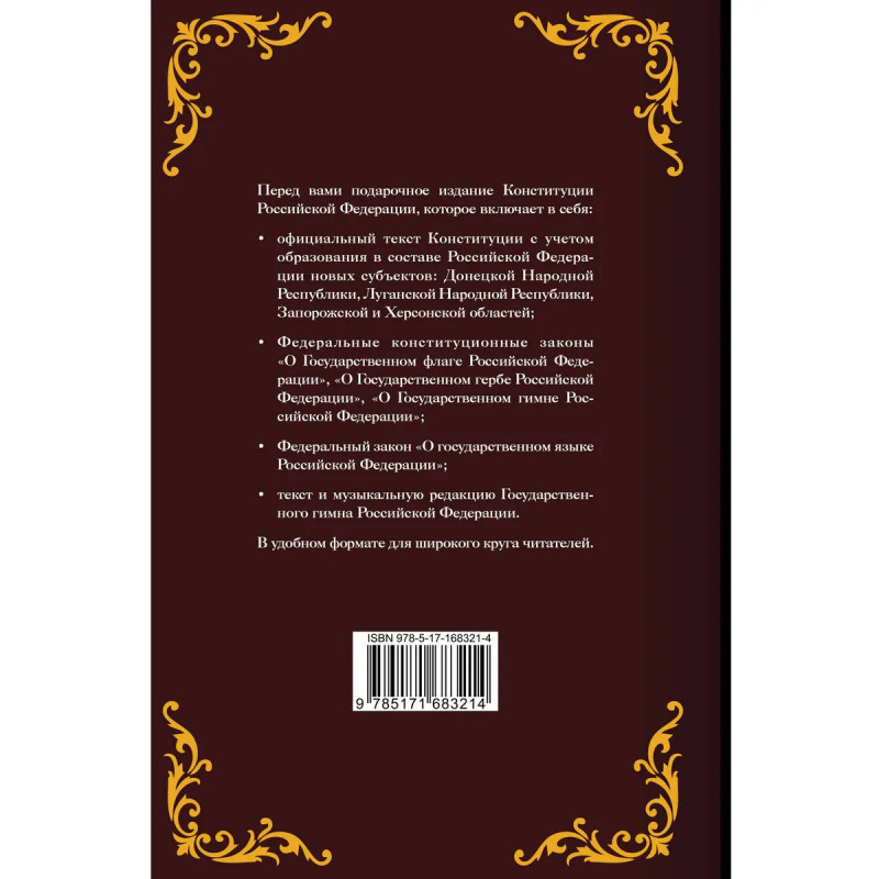 Перед вами подарочное издание Конституции Российской Федерации, которое включает в себя: официальный текст Конституции РФ с учетом образования в составе Российской Федерации новых субъектов: Донецкой Народной Республики, Луганской Народной Республики, Запорожской и Херсонской областей; Федеральные конституционные законы "О Государственном флаге Российской Федерации", "О Государственном гербе Российской Федерации", "О Государственном гимне Российской Федерации"; Федеральный закон "О государственном языке Российской Федерации"; текст и музыкальную редакцию Государственного гимна Российской Федерации. В удобном формате для широкого круга читателей.