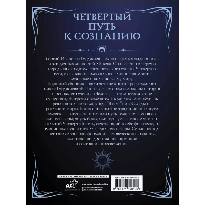 Георгий Иванович Гурджиев одна из самых выдающихся и загадочных личностей ХХ века. Философ-мистик, писатель, композитор, путешественник, основатель Института гармонического развития человека, он известен в первую очередь как создатель эзотерического учения Четвертого пути, оказавшего колоссальное влияние на многие духовные школы по всему миру. В данный сборник вошли четыре книги программного цикла Гурджиева "Всё и вся", в котором изложены история и основы его учения: "Человек это многосложное существо", "Встречи с замечательными людьми", "Жизнь реальна только тогда, когда Я есть" и "Взгляды из реального мира". В них описаны три традиционных пути человека "путь факира", или путь тела; "путь монаха", или путь веры; "путь йога", или путь ума; а также универсальный Четвертый путь, сочетающий в себе физическую, эмоциональную и интеллектуальную сферы. Сутью последнего является трансформация человеческого сознания, включающая достижение гармонии и состояния просветления.