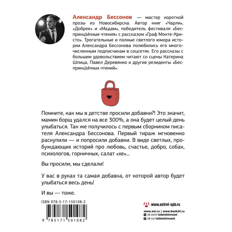 Помните, как мы в детстве просили добавки?! Это значит, мамин борщ удался на все 300%, а она будет целый день улыбаться. Так же получилось с первым сборником писателя Александра Бессонова. Первый тираж мгновенно раскупили — и попросили добавки. В виде светлых, пробуждающих историй про любовь, счастье, добро, собак, психологов, горничных, салат "хе"… Вы просили, мы сделали! У вас в руках та самая добавка, от которой автор будет улыбаться весь день! И вы — тоже. Александр Бессонов — мастер короткой прозы из Новосибирска. Автор книг "Чарли", "Добрее" и "Мадам", победитель фестиваля "БеспринцЫпные чтения" с рассказом "Граф Монте-Кристо". Трогательные и полные светлого юмора истории Александра Бессонова полюбились его многочисленным подписчикам в соцсетях. Его рассказы с большим удовольствием читают со сцены Катерина Шпица, Павел Деревянко и другие резиденты "БеспринцЫпных чтений".