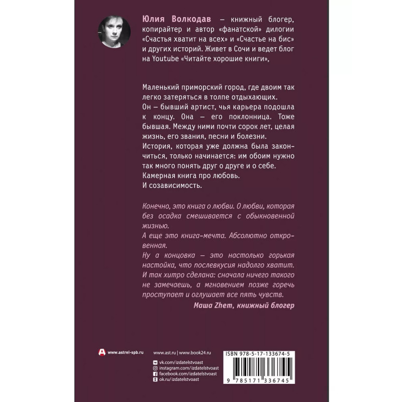 Счастье на бис. Маленький приморский город, где двоим так легко затеряться в толпе отдыхающих. Он - бывший артист, чья карьера подошла к концу. Она - его поклонница. Тоже бывшая. Между ними почти сорок лет, целая жизнь, его звания, песни и болезни. История, которая уже должна была закончиться, только начинается: им обоим нужно так много понять друг о друге и о себе. Камерная книга про любовь. И созависимость. "Конечно, это книга о любви. О любви, которая без осадка смешивается с обыкновенной жизнью. А еще это книга-мечта. Абсолютно откровенная. Ну а концовка - это настолько горькая настойка, что послевкусия надолго хватит. И так хитро сделана: сначала ничего такого не замечаешь, а мгновением позже горечь проступает и оглушает все пять чувств". Маша Zhem, книжный блогер