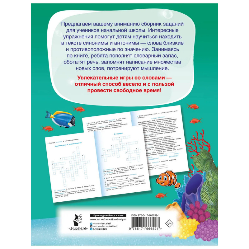 В развивающей книжке Синонимы и антонимы. Головоломки и кроссворды для начальной школы словарные головоломки на любой вкус. Ученик начальной школы узнает, что такое синонимы и антонимы, запомнит правописание слов, пополнит словарный запас, сможет развить мышление, внимание, память. Интересные и весёлые задания не дадут заскучать: обучение превратится для ребёнка в увлекательную игру.
