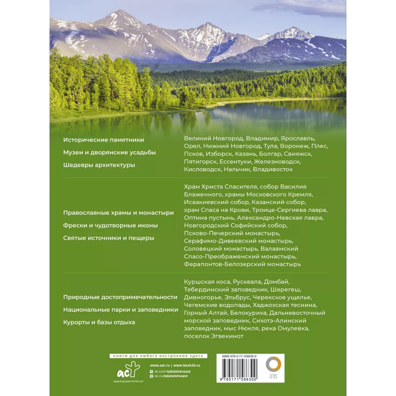 Эта книга своеобразный путеводитель по необъятным просторам России от Куршской косы Калининградской области до побережья Японского моря на Дальнем Востоке. Издание представляет зрелищные фотографии и увлекательные очерки не только о самых известных и посещаемых местах нашей страны, но и о тех, которые стали набирать популярность лишь в настоящее время. Вы сможете познакомиться с древними и молодыми российскими городами и их окрестностями, совершить виртуальное паломничество по самым намоленным православным храмам и монастырям и таким образом приобщиться к духовной сокровищнице Святой Руси, а также восхититься неповторимыми природными достопримечательностями Кавказа и Саян, Карелии и Горного Алтая, Уссурийского края и Колымы. Читатель найдет в книге и важную практическую информацию о том, когда лучше отправиться в то или иное место, каким транспортом туда удобнее добираться и что следует посмотреть в первую очередь.