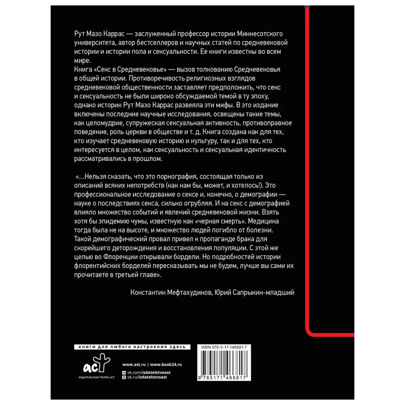 Рут Мазо Каррас — заслуженный профессор истории Миннесотского университета, автор бестселлеров и научных статей по средневековой истории и истории пола и сексуальности. Ее книги известны во всем мире. Книга "Секс в Средневековье" – вызов толкованию Средневековья в общей истории. Противоречивость религиозных взглядов средневековой общественности заставляет предположить, что секс и сексуальность не были широко обсуждаемой темой в ту эпоху, однако историк Рут Мазо Каррас развеяла эти мифы. В это издание включены последние научные исследования, освещены такие темы как целомудрие, супружеская сексуальная активность, противоправное поведение, роль церкви в обществе и т д. Книга создана как для тех, кто изучает средневековую историю и культуру, так и для тех, кто интересуется в целом, как сексуальность и сексуальная идентичность рассматривались в прошлом.