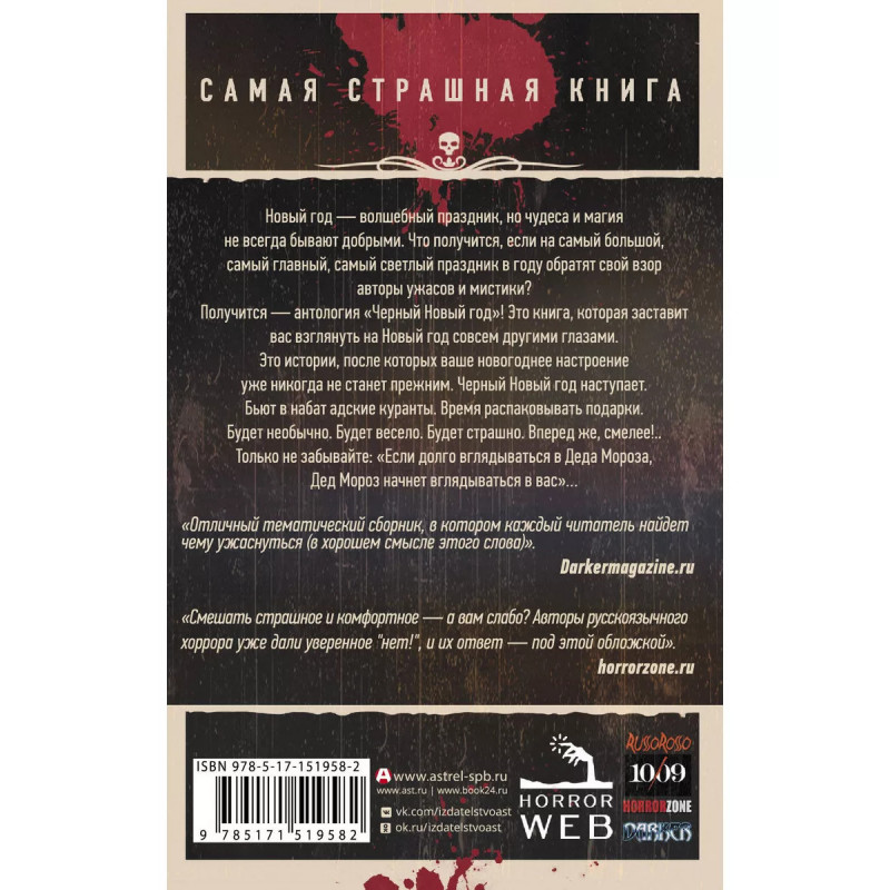 Самая страшная книга. Черный Новый год. Спецвыпуск серии "Самая страшная книга" - уникального проекта издательства "АСТ", не имеющего аналогов в мире. Сборник российского хоррора - жуткого, пугающего и новогоднего. Под Новый год семьи собираются вместе у домашнего очага, а чудеса случаются с каждым то тут, то там Кажется, будто волшебство наполняет жизни российских граждан, собравшихся у новогоднего стола, чтобы в который раз включить Голубой огонёк, а потом, под бой курантов, загадать самое заветное желание - в новом году оно обязательно сбудется. Но никто не задумывается о главном. Вкусное мамино оливье теперь готовится с совсем другим "секретным ингредиентом" - с любовью порубленной плотью соседа дяди Васи. Случайные прохожие, под вечер заглянувшие за угощениями к новогоднему столу, натыкаются на проклятых работников супермаркета. А в окна российских квартир смотрит кровожадный Дед Мороз, ждущий удобного момента, чтобы похитить детей на свой собственный праздник.