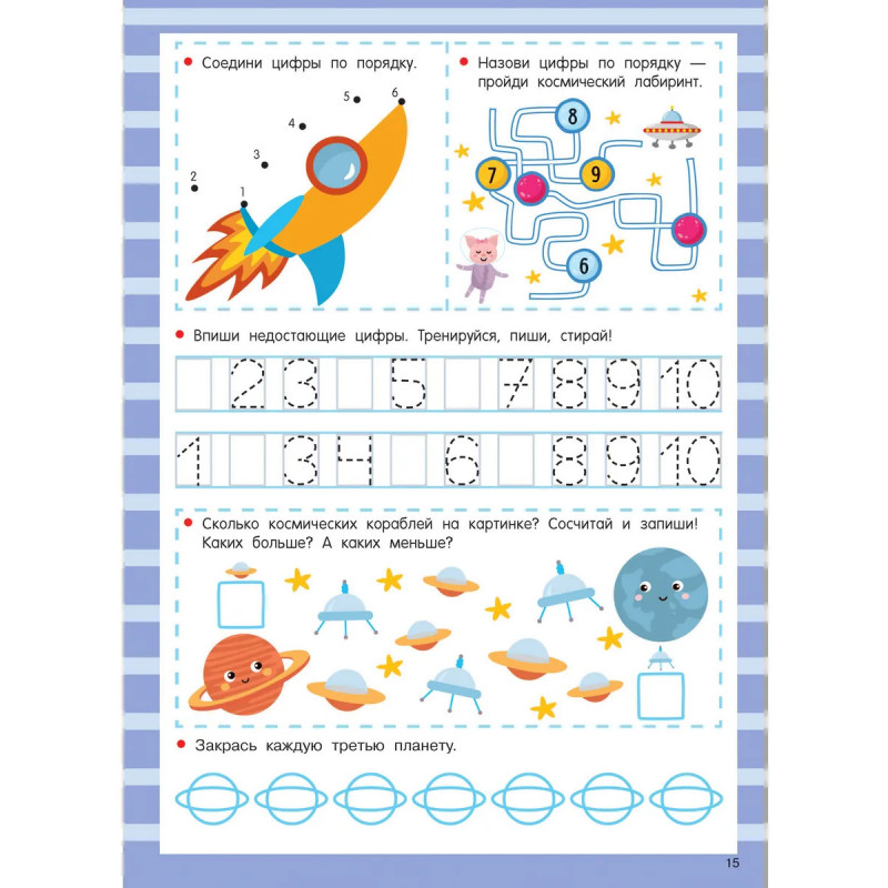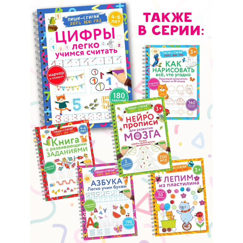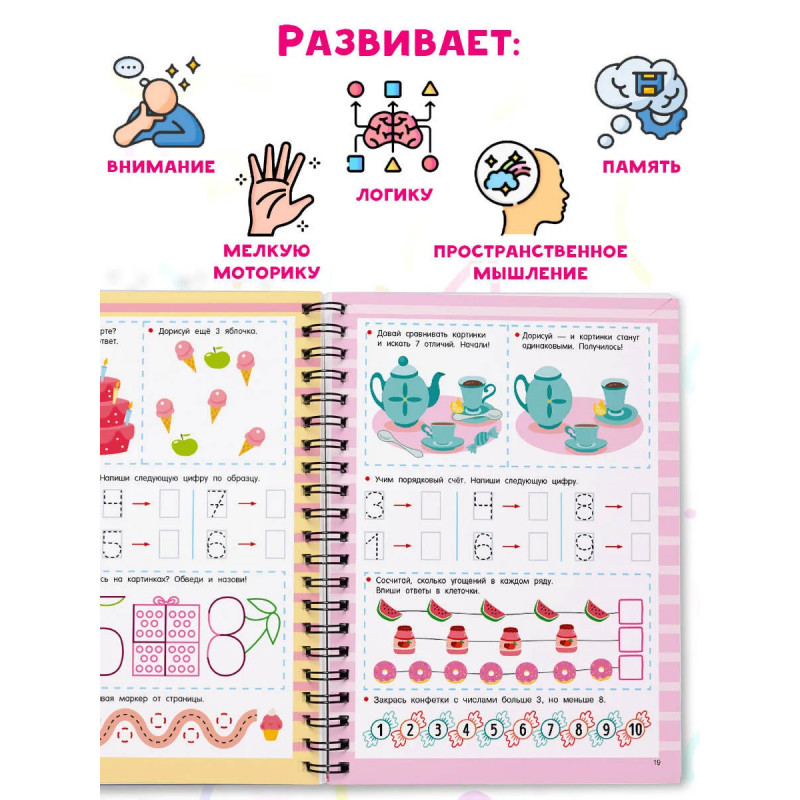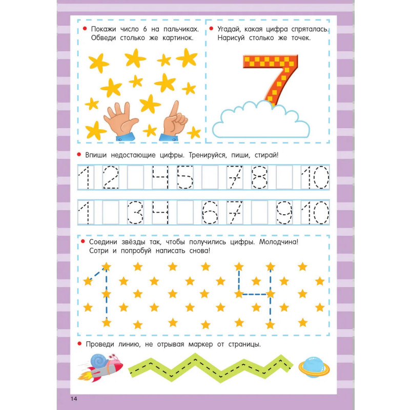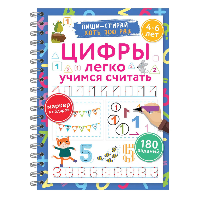 Активити-книга для знакомства с цифрами от 1 до 10 — это одновременно и развлекательная, и обучающая, и познавательная книжка, и рабочая тетрадь. Пиши + стирай + учись + новое узнавай: • Буквально несколько занятий — и ребёнок уже складывает и вычитает в пределах 10. • Игровые задания развивают мышление и интеллект, мелкую моторику и графические навыки, формируют математические представления и закрепляют правила выполнения простых математических действий. • Великолепная подборка иллюстраций, яркое и стильное оформление. • Мелованный картон, ламинированные страницы делают книгу многоразовой, прочной и износостойкой, а благодаря спирали ребёнку легко и удобно перелистывать плотные страницы с закругленными уголками. • Малыш будет рисовать, писать, стирать, решать. И всё это — много-много раз!