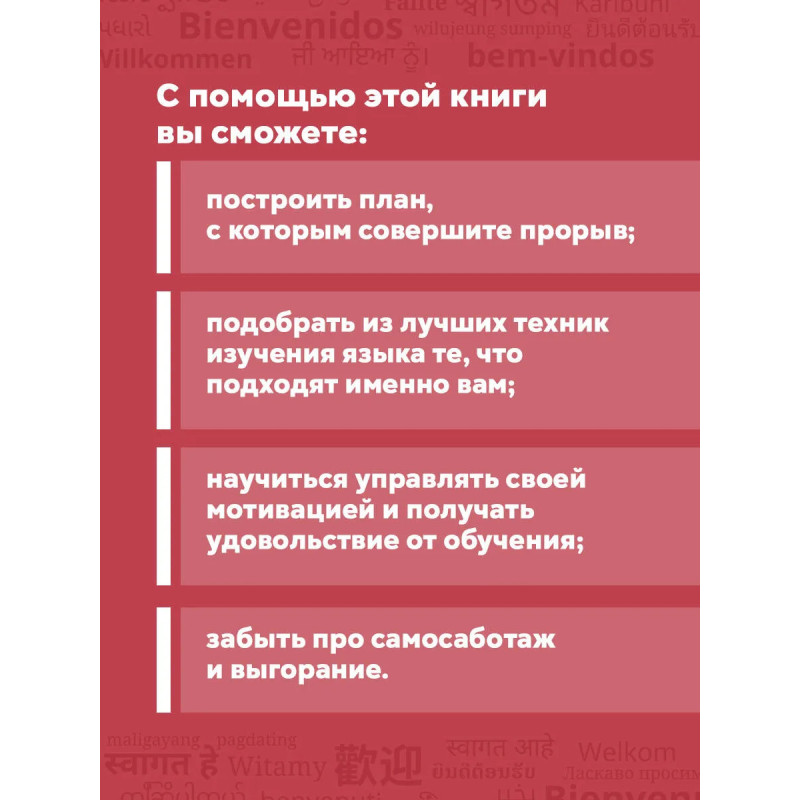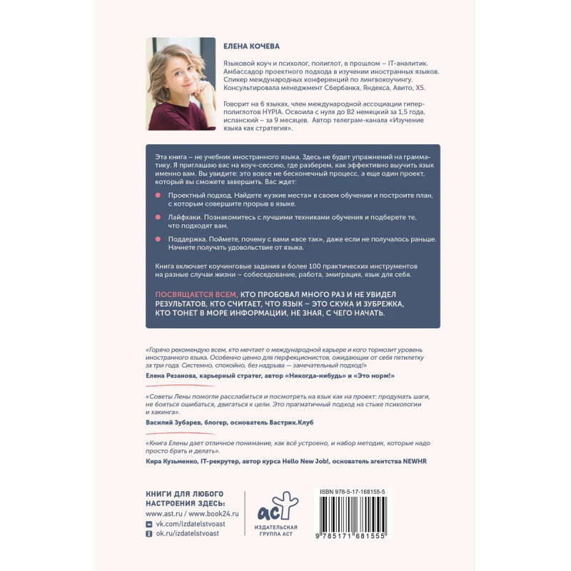 Эта книга не учебник иностранного языка. Здесь не будет упражнений на грамматику. Автор приглашает вас на коуч-сессию, где вы разберете, как эффективно учить язык именно вам. Елена Кочева языковой коуч и психолог, полиглот, в прошлом IT-аналитик. Спикер международных конференций по лингвокоучингу. Консультировала менеджмент Сбербанка, Яндекса, Spotify, Х5. Прочитав эту книгу, вы увидите: изучение языка не бесконечный хаотичный процесс, а еще один проект, который вы сможете завершить. Вас ждет: - Проектный подход. Найдете "узкие места" в своем обучении и построите план, с которым совершите прорыв в языке. - Лайфхаки. Познакомитесь с лучшими техниками изучения языка и подберете те, что подходят вам. - Поддержка. почему с вами "все так", даже если не получалось раньше. Начните получать удовольствие от изучения языка. Книга включает коучинговые задания и более 100 практических инструментов на разные случаи жизни собеседование, работа, эмиграция, язык для себя.