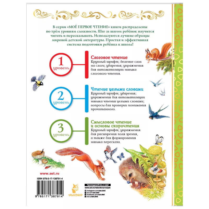 Познавательные сказки для чтения по слогам. 5 причин купить книги серии: - лучшие классические тексты, понятные и интересные дошкольникам - уровни автоматизации навыка чтения - простые и эффективные тренировочные упражнения - регулярное отслеживание успехов малыша - пальчиковая гимнастика для концентрации внимания В серии "МОЁ ПЕРВОЕ ЧТЕНИЕ" книги распределены по трём уровням сложности. Шаг за шагом ребёнок научится читать и пересказывать. Используются лучшие образцы мировой детской литературы. Простая и эффективная система подготовки ребёнка к школе! Уровень 1. Слоговое чтение Крупный шрифт; деление слов на слоги; ударения; упражнения для автоматизации навыка слогового чтения. Уровень 2. Чтение целыми словами Крупный шрифт; ударения; упражнения для автоматизации навыка чтения целыми словами; вопросы для проверки понимания прочитанного. Уровень 3. Смысловое чтение и основы скорочтения Крупный шрифт; упражнения для расширения поля зрения, а также для формирования навыка пересказа.