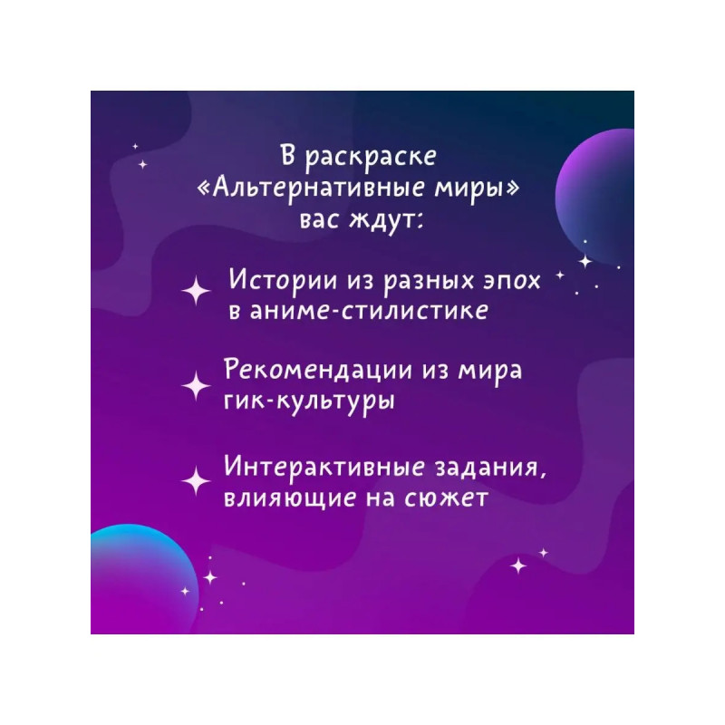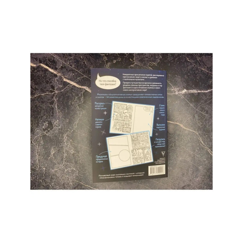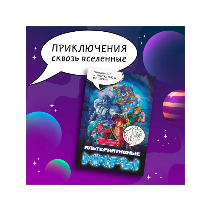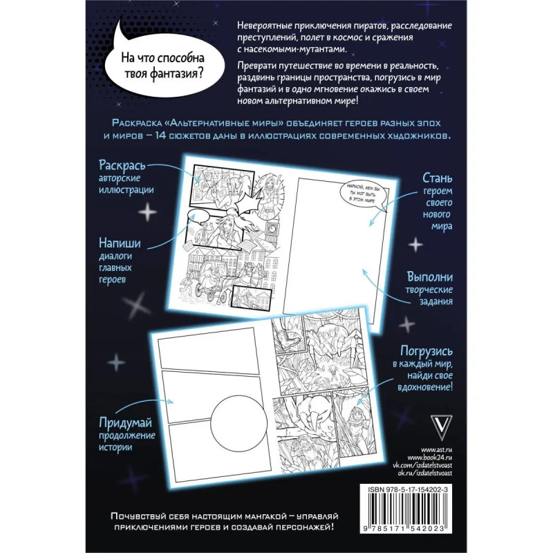 Раскрашивай авторские иллюстрации и придумывай собственные! Альтернативные миры это уникальный фанбук для тех, кто хочет создать свою собственную мангу. Выполняя творческие задания, продумывая сюжетные линии, персонажей и диалоги, ты станешь автором настоящего комикса. А еще ты научишься работать с цветами и оттенками, прорисовывать линии движения и накладывать скринтоны.