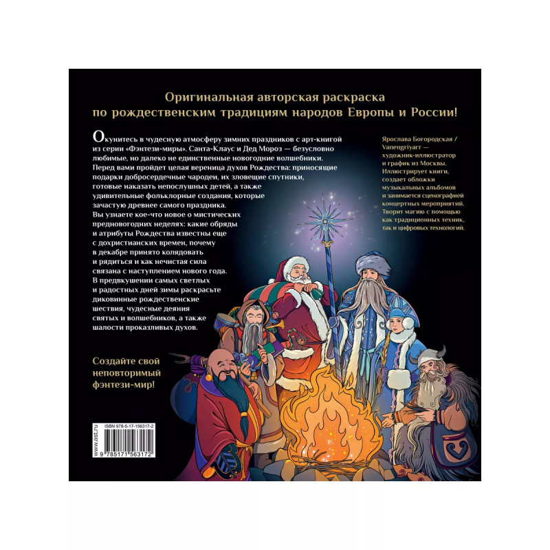 Крампус, йольский кот и другие духи Рождества. Оригинальная авторская раскраска по рождественским традициям народов Европы и России! Окунитесь в чудесную атмосферу зимних праздников с арт-книгой из серии "Фэнтези-миры". Санта-Клаус и Дед Мороз - безусловно, любимые, но далеко не единственные новогодние волшебники. Перед вами пройдет целая вереница духов Рождества: приносящие подарки добросердечные чародеи, их зловещие спутники, готовые наказать непослушных детей, а также удивительные фольклорные создания, которые зачастую древнее самого праздника. Вы узнаете кое-что новое о мистических предновогодних неделях: какие обряды и атрибуты Рождества известны еще с дохристианских времен, почему в декабре принято колядовать и рядиться и как нечистая сила связана с наступлением нового года. В предвкушении самых светлых и радостных дней зимы раскрасьте диковинные рождественские шествия, чудесные деяния святых и волшебников, а также шалости проказливых духов. Создайте свой неповторимый фэнтези-мир! " 12 цветных полос содержат авторские иллюстрации и интересные факты