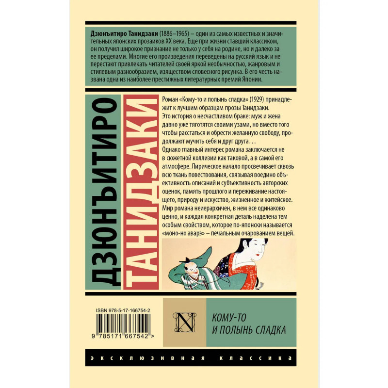 Дзюнъитиро Танидзаки известный японский писатель XX века, тонкий стилист, мастер литературных аллюзий и смелый экспериментатор, произведения которого не раз вызывали бурную реакцию публики вплоть до дебатов в парламенте. Известность к Танидзаки пришла после выхода эссе Похвала тени, которое можно назвать манифестом японской эстетики. Написанный в 1929 году роман Кому-то и полынь сладка грустная и пронзительная история супругов, которые тяготятся своим браком, но не решаются подарить друг другу свободу.