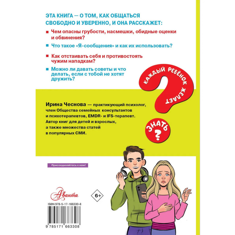 В своей новой книге известный психолог Ирина Чеснова раскроет юным читателям младшим и средним школьникам все секреты общения. Книга подскажет, как быть доброжелательным, но твердым, отстаивать свои интересы, реагировать на грубости, разрешать конфликты, говорить "нет" - в общем, как общаться свободно и уверенно, оставаясь при этом собой. А также как развивать отношения с тем, кто нравится, и не бояться говорить о том, что на душе. Для младшего и среднего школьного возраста.