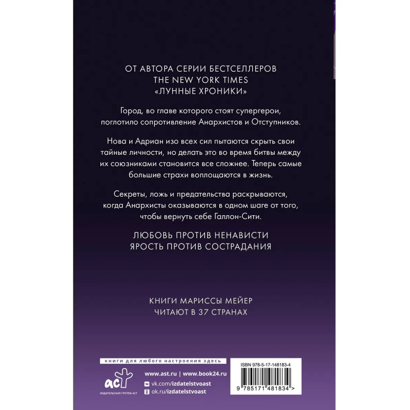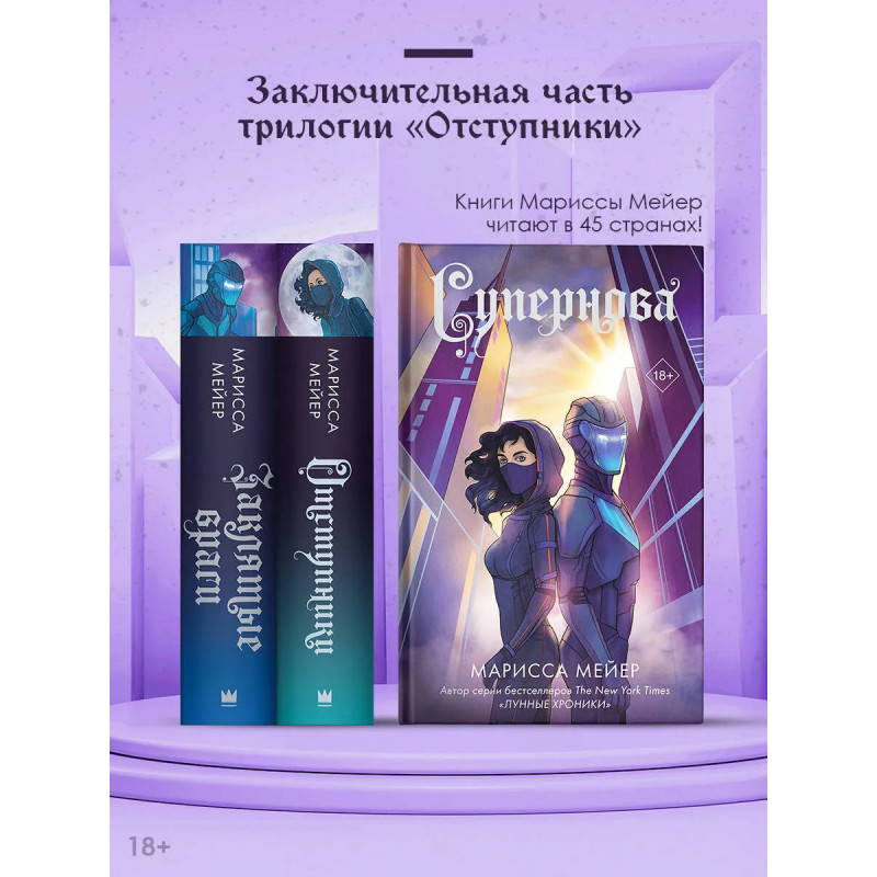 — Долгожданная заключительная часть трилогии «Отступников» — бестселлера по версии The New York Times! — YA-фэнтези. Вас ждут динамичный сюжет, а также любовь, супергерои, анархисты и разрушенный мир. — Марисса Мейер — автор серии «Лунные хроники» и популярного подкаста «The Happy Writer». Книги автора читают в 45 странах! — Автор выстроила мрачную вселенную, в которой линия между добром и злом стирается на глазах читателей. — Готовьтесь, «Супернова» будет самой мрачной частью трилогии. Правда о смерти Леди Неукротимой, испытания и потери самых близких людей — это последняя смертельная миссия Новы и Адриана.