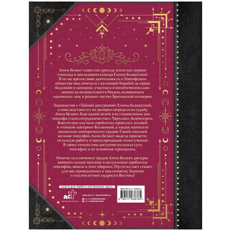 Анни Безант известна прежде всего как первая ученица и последовательница Елены Блаватской. В то же время свою деятельность в Теософском обществе она сочетала с активной борьбой за права бедняков и женщин, участием в политическом движении за независимость Индии, основанием масонских лож в разных частях Британской империи. Знакомство с "Тайной доктриной" Елены Блаватской, а впоследствии и с ее автором определило судьбу Анни Безант. Еще одной вехой в ее становлении как теософа стало сотрудничество с Чарльзом Ледбитером. Вместе они изучали проблемы прошлых жизней и "тонкой материи" Вселенной, а также написали несколько эзотерических трудов. Своей миссией на ниве теософии Анни Безант видела просветительскую работу и популяризацию идей этого учения. В своих книгах она доступно излагала суть теософии и ее основные принципы. Многие из ключевых трудов Анни Безант, раскрывающих самые важные и актуальные проблемы теософии, вошли в этот сборник.