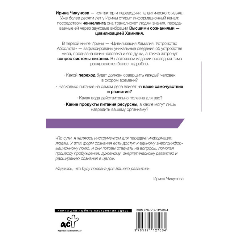 Ирина Чикунова — контактер и переводчик галактического языка. Уже более десяти лет у Ирины открыт информационный канал: посредством ченнелинга она транслирует людям знания, передаваемые ей через звуковые вибрации Высшими сознаниями — цивилизацией Хамилия. В первой книге Ирины — "Цивилизация Хамилия. Устройство Абсолюта" — зафиксированы уникальные сведения об устройстве мира, предназначении человека и его души, а также затронут вопрос системы питания. В настоящем издании последняя тема раскрывается более подробно. • Какой переход будет должен совершить каждый человек в скором времени? • Насколько питание на самом деле влияет на ваше самочувствие и развитие? • Какая вода действительно полезна для вас? • Какие продукты питания ресурсны, а какие могут лишь навредить вашему организму?