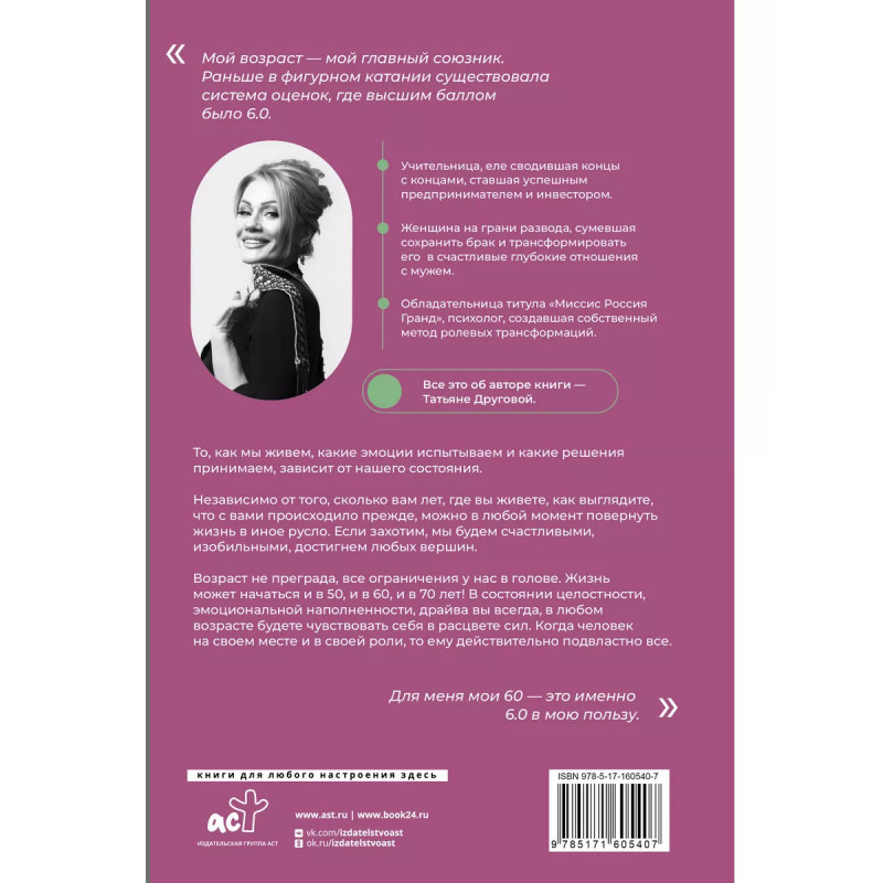 Жизнь в свою пользу: фокус на себе. Учительница, еле сводившая концы с концами, ставшая успешным предпринимателем и инвестором. Женщина на грани развода, сумевшая сохранить брак и трансформировать его в счастливые глубокие отношения с мужем. Обладательница титула "Миссис Россия Гранд", создатель собственного метода ролевых трансформаций. Все это об авторе книги - Татьяне Друговой. То, как мы живем, какие эмоции испытываем и какие решения принимаем, зависит от нашего состояния. Независимо от того, сколько вам лет, где вы живете, как выглядите, что с вами происходило прежде, можно в любой момент повернуть жизнь в иное русло. Если захотим, мы будем счастливыми, изобильными, достигнем любых вершин. Возраст не преграда, все ограничения у нас в голове. Жизнь может начаться и в 50, и в 60, и в 70 лет! В состоянии целостности, эмоциональной наполненности, драйва вы всегда, в любом возрасте будете чувствовать себя в расцвете сил. Когда человек на своем месте и в своей роли, то ему действительно подвластно все.