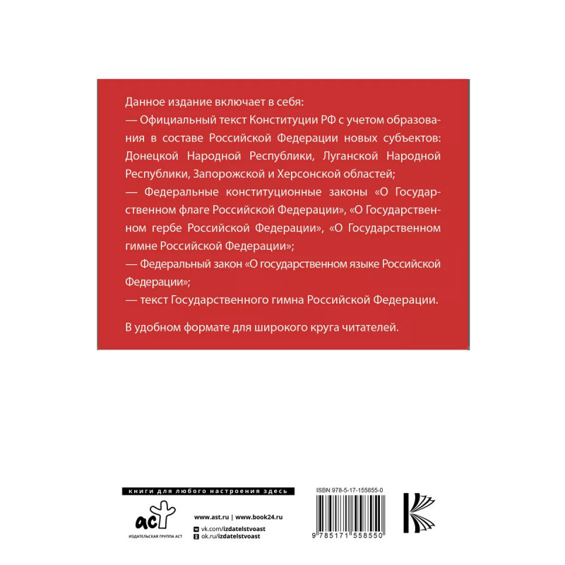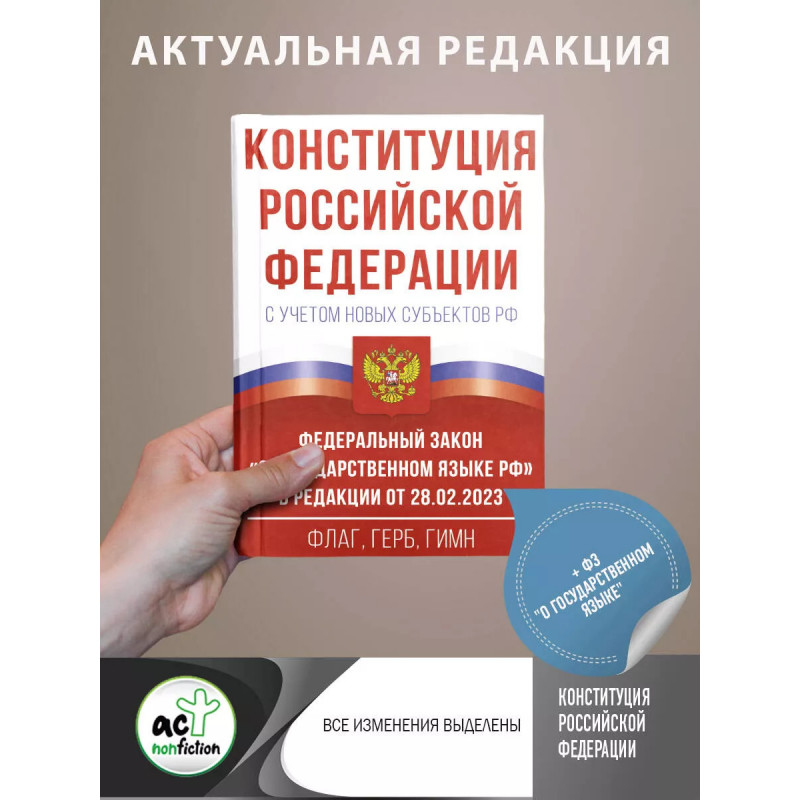 В соответствии с Конституцией Российской Федерации государственным языком Российской Федерации на всей ее территории является русский язык как язык государствообразующего народа, входящего в многонациональный союз равноправных народов Российской Федерации. В целях совершенствования механизмов обеспечения статуса русского языка и осуществления контроля за соблюдением норм современного литературного языка Федеральным Собранием РФ внесены изменения в Федеральный закон "О государственном языке Российской Федерации". Данное издание включает в себя: официальный текст Конституции РФ с учетом образования в составе Российской Федерации новых субъектов: Донецкой Народной Республики, Луганской Народной Республики, Запорожской и Херсонской областей Федеральные конституционные законы "О Государственном флаге Российской Федерации", "О Государственном гербе Российской Федерации", "О Государственном гимне Российской Федерации" Федеральный закон "О государственном языке Российской Федерации".