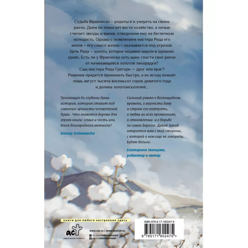 От автора романов Дыхание. Судьба принца и Пой. История Тома Фрая. Увлекательная и трогательная одиночная история о молодом ранчеро в вестерн-декорациях. Американский запад, 1849 год. Молодой ранчеро Франческо всю свою жизнь прожил на родном ранчо и почти уверен, что на нем же и умрет. Но появление в его краях богатого и влиятельного мистера Рида способно все изменить. Рид ищет золото, которое недавно обнаружили в этих краях, и ему нужны земли Франческо. Сын мистера Рида Грегори, занимает сторону Франческо. Встреча Франческо и Грегори предопределит не только их судьбу, но и всего ранчо.