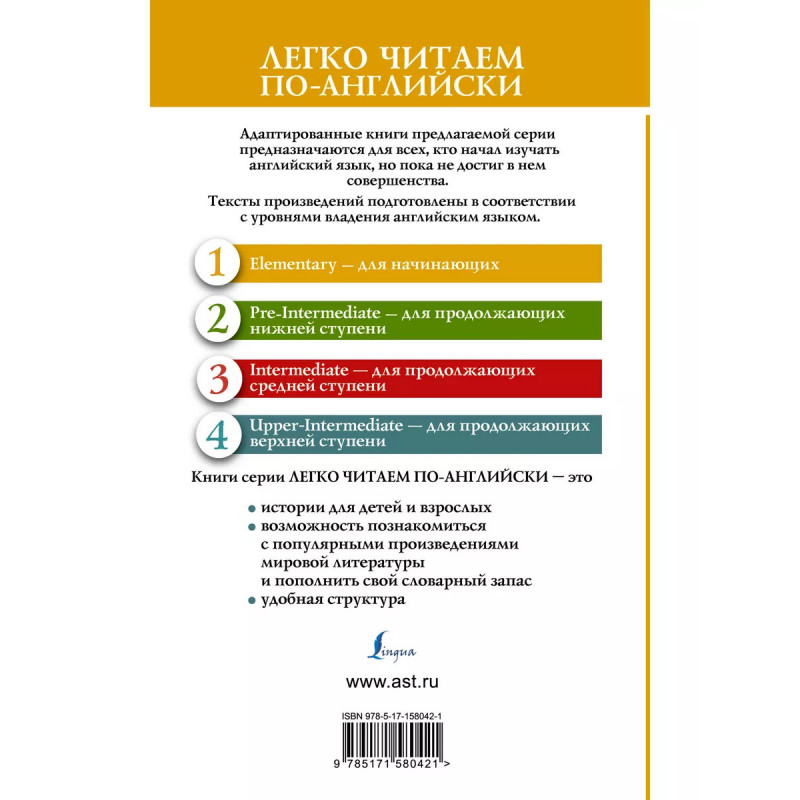 Поворот винта. Уровень 1 The Turn of the Screw. В доме только миссис Гроуз, маленькие Майлс и Флора - мои милые ангелочки! - слуги и я. Предыдущая гувернантка ушла и не вернулась, о её смерти узнали из письма. Тело лакея, который воспитывал мальчика, нашли у дороги. Они не могут быть живы, но они живы, и они здесь, и дети что-то знают. Дети хотят уйти к ним, уйти с ними, уйти навсегда - я знаю, что дети что-то знают, и они должны всё рассказать. Пока я еще могу их спасти. "Поворот винта" - повесть американского писателя Генри Джеймса, один из признанных шедевров готической литературы. Теперь она доступна и для тех, кто только начинает учить английский язык. В нашем издании произведение Джеймса адаптировано для изучающих английский на начальном уровне (Уровень 1 - Elementary), сопровождается комментариями и словарём.