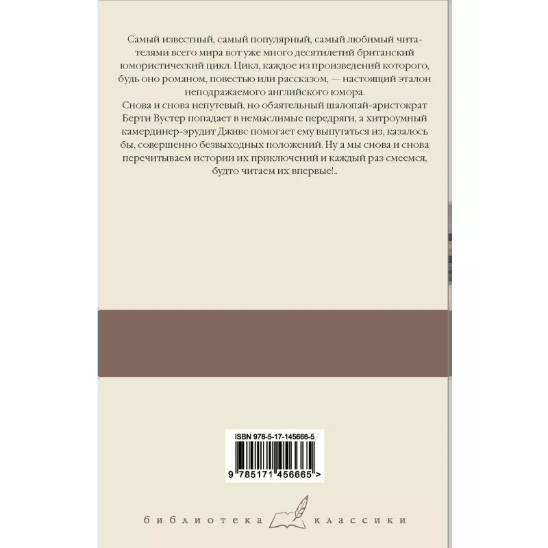 Самый известный, самый популярный, самый любимый читателями всего мира вот уже много десятилетий британский юмористический цикл. Цикл, каждое из произведений которого, будь оно романом, повестью или рассказом, - настоящий эталон неподражаемого английского юмора. Снова и снова непутевый, но обаятельный шалопай-аристократ Берти Вустер попадает в немыслимые передряги, а хитроумный камердинер-эрудит Дживс помогает ему выпутаться из, казалось бы, совершенно безвыходный положений. Ну а мы снова и снова перечитываем истории их приключений и каждый раз смеемся, будто читаем их впервые!..