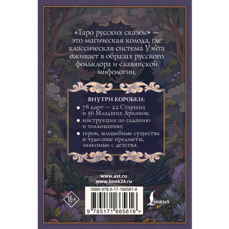 "Таро русских сказок" — это магическая колода, где классическая система Уэйта оживает в образах русского фольклора и славянской мифологии. В этих 78 картах — 22 Старших и 56 Младших Арканах — живут герои, волшебные существа и чудесные предметы, знакомые с детства. Каждый Аркан здесь рассказывает свою историю и передает свою мудрость, предлагая интуитивное понимание через архетипы русских сказок. В этой колоде древние символы Таро переплетаются с духом народных преданий, создавая уникальное пространство для познания себя и мира. В коробке удобного карманного формата находится инструкция для гадания и толкования карт.