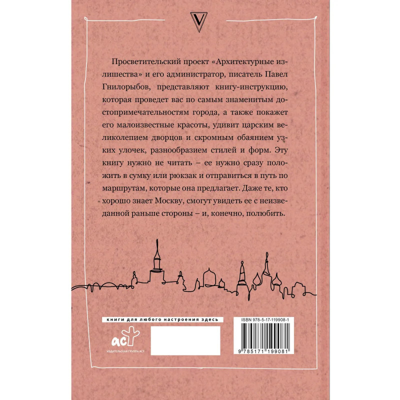 Просветительский проект "Архитектурные излишества" и его администратор, писатель Павел Гнилорыбов, представляют книгу-инструкцию, которая проведет вас по самым знаменитым достопримечательностям города, а также покажет его малоизвестные красоты, удивит царским великолепием дворцов и скромным обаянием узких улочек, разнообразием стилей и форм. Эту книгу нужно не читать ее лучше сразу положить в сумку или рюкзак и отправиться в путь по маршрутам, которые она предлагает. Даже те, кто хорошо знает Москву, смогут увидеть ее с неизведанной раньше стороны и, конечно, полюбить.