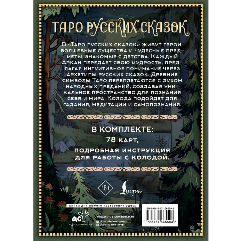 "Таро русских сказок" — это магическая колода, где классическая система Уэйта оживает в образах русского фольклора и славянской мифологии. В этих 78 картах — 22 Старших и 56 Младших Арканах — живут герои, волшебные существа и чудесные предметы, знакомые с детства. Каждый Аркан здесь рассказывает свою историю и передает свою мудрость, предлагая интуитивное понимание через архетипы русских сказок. В этой колоде древние символы Таро переплетаются с духом народных преданий, создавая уникальное пространство для познания себя и мира. Подарочная коробка с подробной брошюрой-инструкцией внутри позволит совершить полное погружение в мир мистического фольклора.