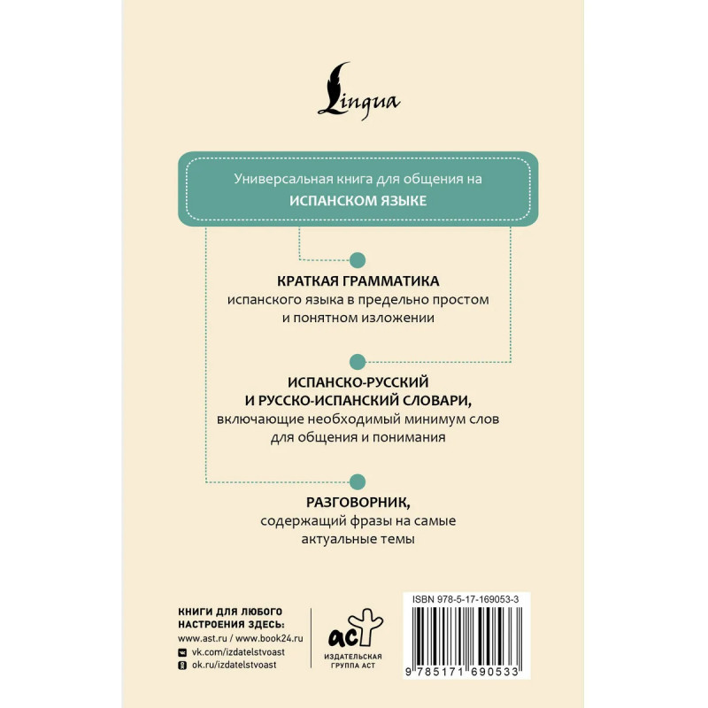 Книга представляет собой современный тип самоучителя и состоит из 4 частей, содержащих самые нужные материалы для обучения иностранному языку: разговорник, испанско-русский и русско-испанский словари, а также раздел со сведениями по грамматике испанского языка в предельно простом и понятном изложении.