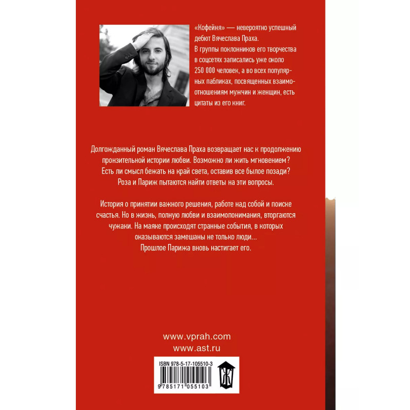 Кофейня на берегу океана. Льняное платье в пол, запах лаванды, глаза с изумрудным оттенком, соленые брызги, свежий теплый ветер, врывающийся в открытое окно, и, конечно, аромат крепкого свежезаваренного кофе. Новый роман Вячеслава Праха, как и два предыдущих произведения этой культовой серии, построен, прежде всего, на ощущениях. Здесь не менее важную, чем сюжетные ходы, роль играют отдаленные звуки классической музыки, теплое прикосновение ступней к золотому песку, скрип лестницы в маяке, одиноко стоящем на самом краю земли, и постоянный шум волн. Из этих ярких осколков складывается мир Розы и Парижа, людей со странными именами и непростым прошлым, которое они и пытаются забыть в этом райском уголке. Кажется, что в этом мгновении счастья можно жить как угодно долго, без резких движений, постепенно залечивая свои раны и осторожно вылезая из своих раковин. Но, увы, скрыться от своего прошлого оказывается не так-то просто. Уникальный язык Праха, его необычная манера повествования - это, скорее, даже работа не со словом, а с краской. Сво