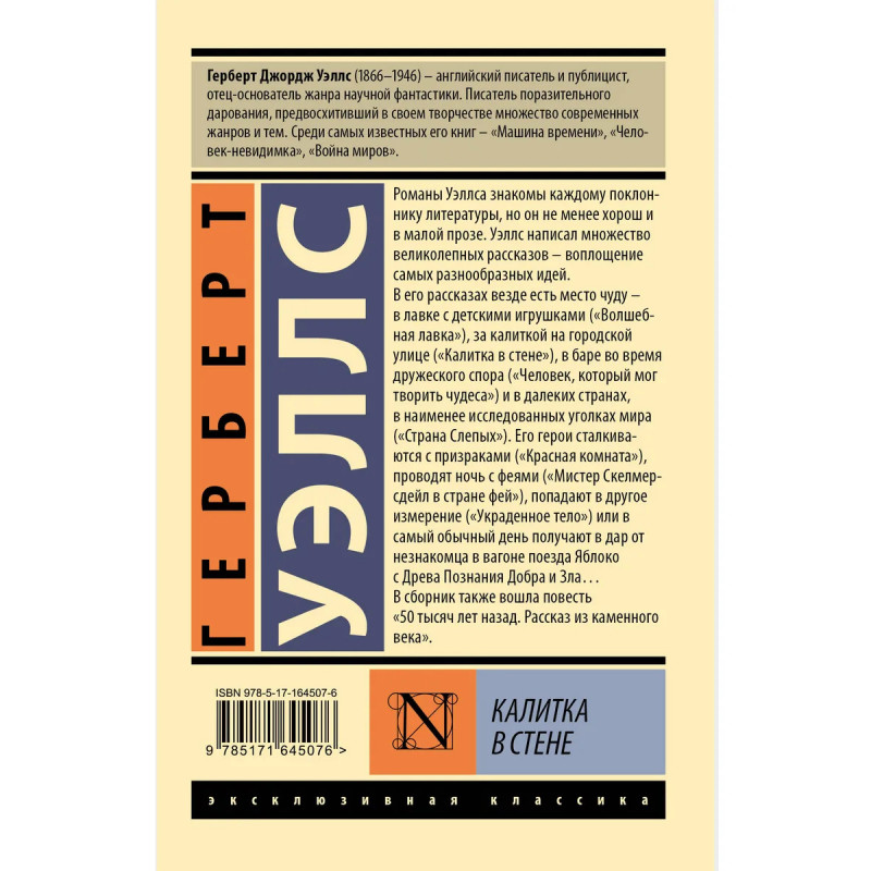 — Имя Герберта Уэллса знакомо каждому поклоннику литературы. Автор романов «Машина времени», «Война миров» и «Остров доктора Моро», Уэллс едва ли не в одиночку создал жанр научной фантастики. — Не менее хорош Уэллс был и в малой прозе. За свою карьеру автор сочинил множество великолепных рассказов — настоящее воплощение самых разных идей. В рассказах писателя всегда находится место чуду. — В данное издание вошла также повесть «50 тысяч лет назад. Рассказ из каменного века». — Издание в серии «Эксклюзивная классика» — в удобном карманном формате и узнаваемом оформлении.