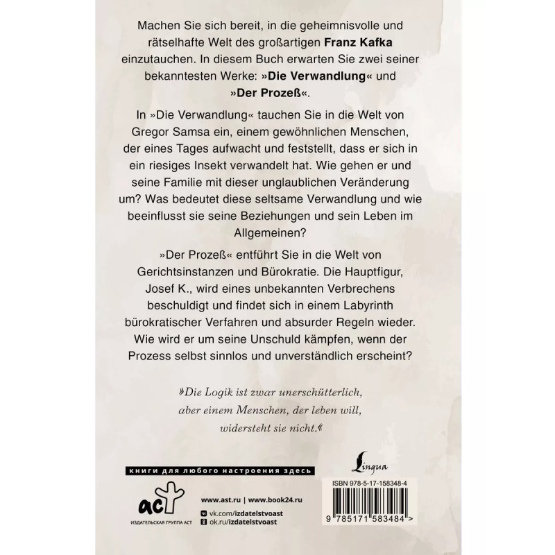 Die Verwandlung. Издание на немецком языке. В книге представлены два самых известных произведения австрийского писателя Франца Кафки - повесть "Превращение" и роман "Процесс", которые поражают своими интригующими сюжетами и глубокой символикой. Через сложные и загадочные лабиринты повествования Франц Кафка обращается к важным вопросам: о сущности человеческой природы, о внутреннем противоречии человека с самим собой и о реальности, находящейся на грани сна и абсурда. Его произведения заставляют задуматься о том, как мы взаимодействуем с окружающим нас миром и как принятые нами решения определяют наши судьбы. Книга издана в неадаптированной версии. Наслаждайтесь загадочным миром Франца Кафки в оригинале!