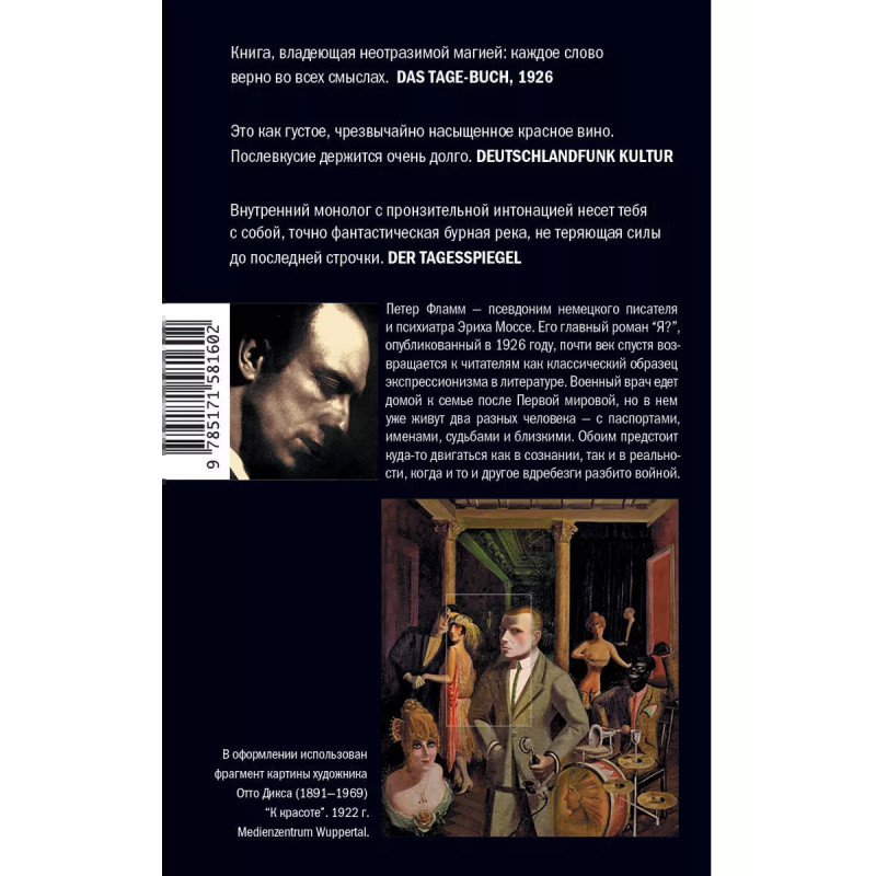 Я? необычный и актуальный психологический роман Петера Фламма, посвященный травме, с которой столкнулись миллионы людей в начале XX века, последствиям Первой мировой войны. Книга вышла в Германии в 1926 году и наделала много шума. Газета Das Berliner Tageblatt назвала тогда роман книжным вулканом из страстей и страданий, а Петер Фламм стал на некоторое время звездой немецкой литературы. Однако успешная в 1920-х годах книга оказалась забыта на многие десятилетия даже на родине писателя, пока немецкому художнику и издателю Себастьяну Гуггольцу не посчастливилось найти этот забытый шедевр в архиве. Так читатели получили возможность вновь познакомиться с этой жемчужиной немецкой литературы. Военный врач, главный герой романа Я?, возвращается с Первой мировой. Ужасы, которые он видел на полях сражений, раскололи его душу надвое. Он не может понять, кто он же он на самом деле: доктор Ханс из Берлина или пекарь Вильгельм из Франкфурта?