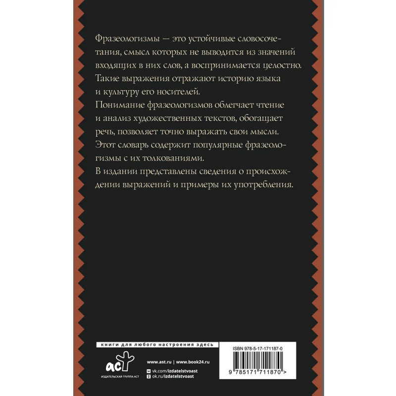 В этом словаре собраны наиболее употребительные фразеологизмы. Каждое устойчивое выражение снабжено толкованием, указанием на сферу употребления и окраску. В издании приводятся исторические или этимологические справки о происхождении фразеологизмов. Приводятся примеры употребления из литературы и устной речи. В первую очередь словарь предназначен школьникам, учащимся в средних классах.