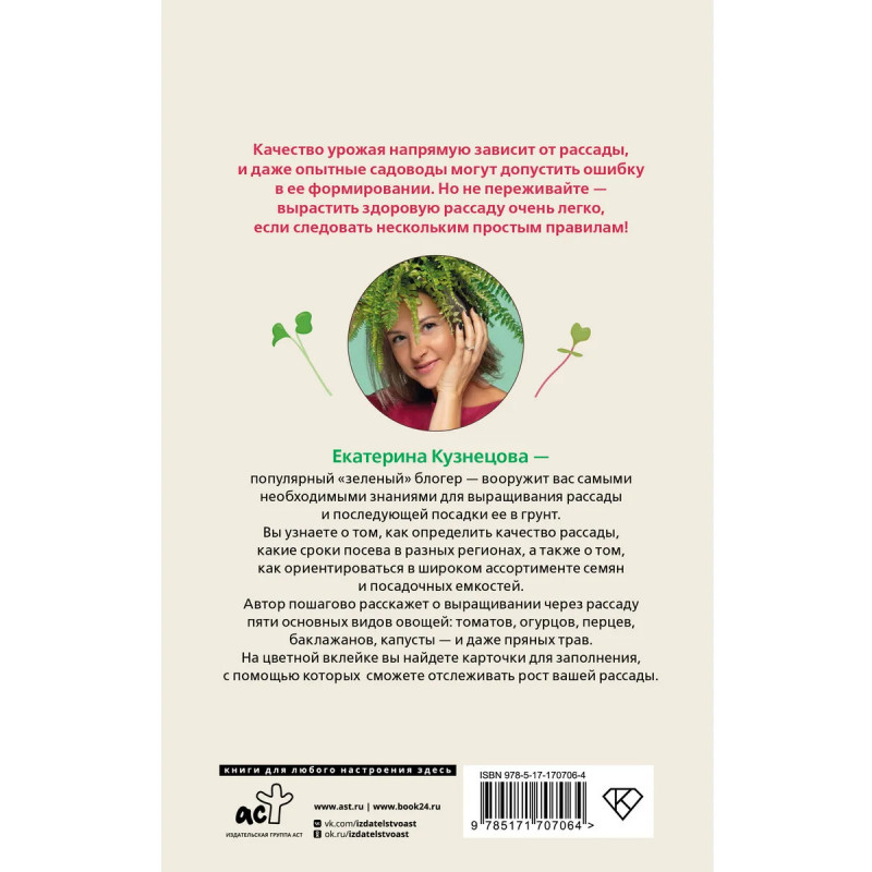 Качество урожая напрямую зависит от рассады, и даже опытные садоводы могут допустить ошибку в ее формировании. Но не переживайте — вырастить здоровую рассаду очень легко, если следовать нескольким простым правилам! И эта книга поможет вам не допустить бабушкиных ошибок, передаваемых из поколения в поколение. Екатерина Кузнецова — популярный "зеленый" блогер — вооружит вас самыми необходимыми знаниями для выращивания рассады и последующей посадки ее в грунт. Вы узнаете о том, как определить качество рассады, какие сроки посева в разных регионах, а также о том, как ориентироваться в широком ассортименте семян и посадочных емкостей. Автор пошагово расскажет о выращивании через рассаду пяти основных видов овощей: томатов, огурцов, перцев, баклажанов, капусты — и даже пряных трав. А на цветной вклейке вы найдете карточки для заполнения, с помощью которых сможете отслеживать рост вашей рассады.