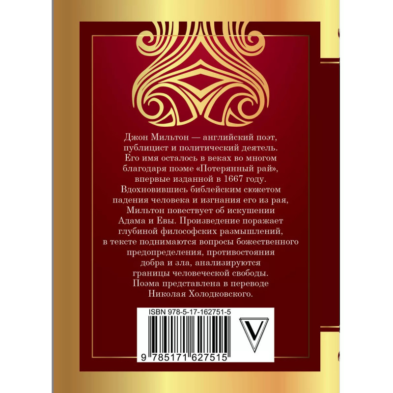 Джон Мильтон английский поэт, публицист и политический деятель. Его имя осталось в веках во многом благодаря поэме "Потерянный рай", впервые изданной в 1667 году. Вдохновившись библейским сюжетом падения человека и изгнания его из рая, Мильтон повествует об искушении Адама и Евы. Произведение поражает глубиной философских размышлений, в тексте поднимаются вопросы божественного предопределения, противостояния добра и зла, анализируются границы человеческой свободы. Поэма представлена в переводе Николая Холодковского.