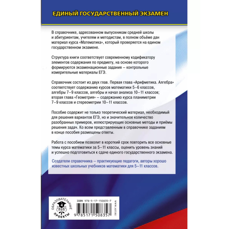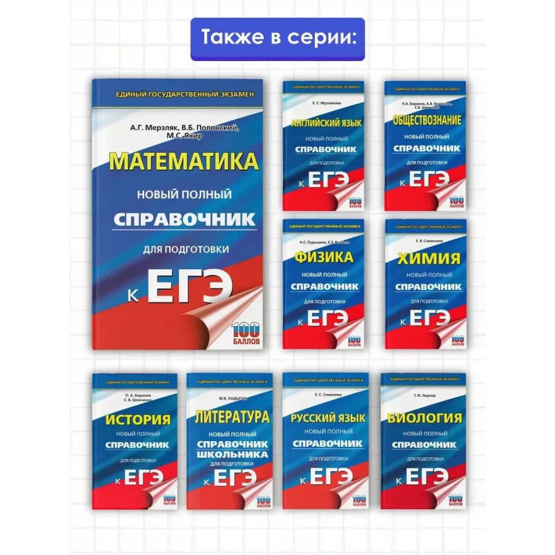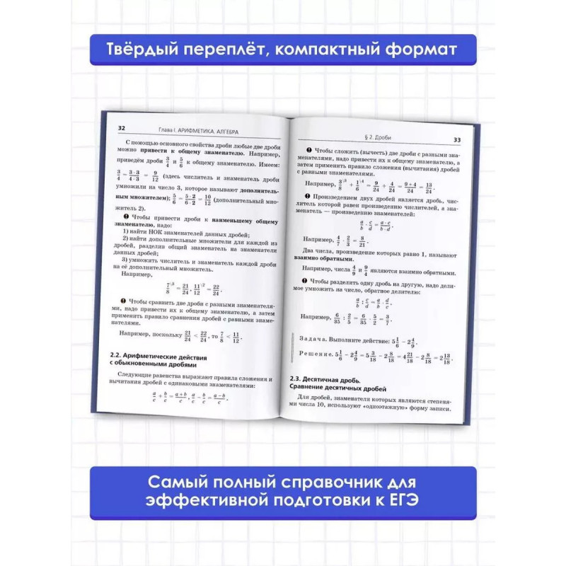 ЕГЭ. Математика. Новый полный справочник для подготовки к ЕГЭ. В справочнике, адресованном выпускникам средней школы и абитуриентам, учителям и методистам, в полном объёме представлен материал курса "Математика", который проверяется на едином государственном экзамене. Структура книги соответствует современному кодификатору элементов содержания по предмету, на основе которого формируются экзаменационные задания - контрольные измерительные материалы ЕГЭ. Справочник состоит из двух глав. Первая глава "Арифметика. Алгебра" соответствует содержанию курсов математики 5-6 классов, алгебры 7-9 классов, алгебры и начал анализа 10-11 классов; вторая глава "Геометрия" - содержанию курса планиметрии 7-9 классов и стереометрии 10-11 классов. Пособие содержит не только теоретический материал, необходимый для решения вариантов ЕГЭ, но и значительное количество разобранных примеров, иллюстрирующих основные методы и приёмы решения задач. Ко всем заданиям в конце пособия даны ответы для самопроверки. Работа с пособием позволит в короткий срок повторить все основные темы курса математики з