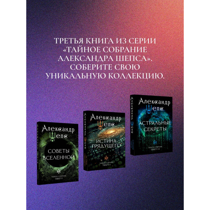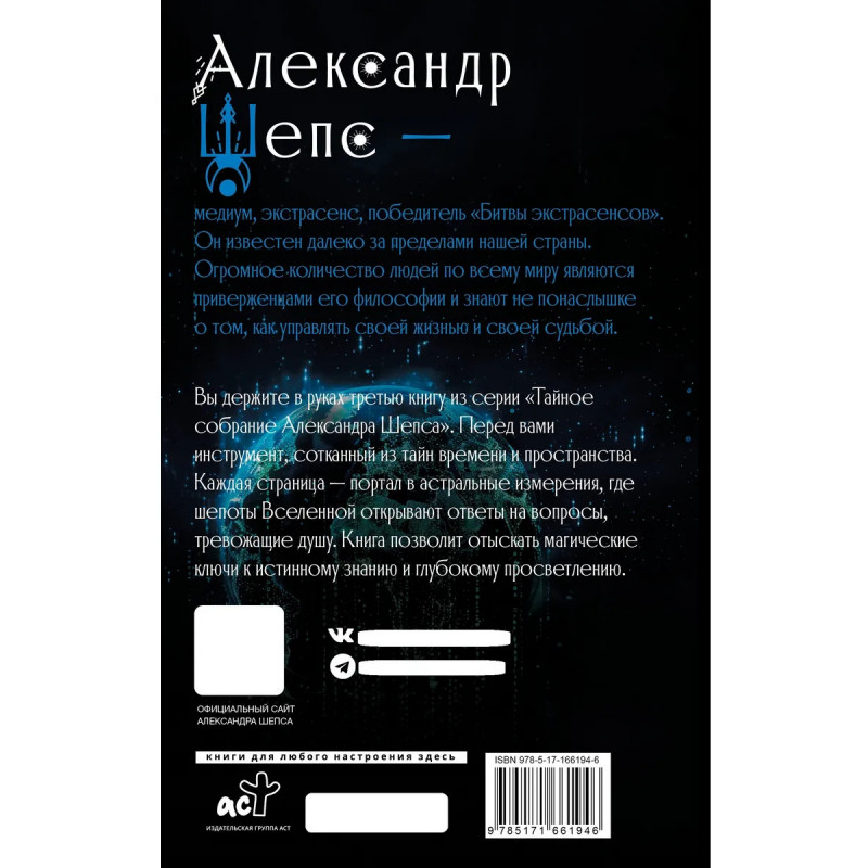 Александр Шепс — медиум, экстрасенс, победитель «Битвы экстрасенсов». Он известен далеко за пределами нашей страны. Огромное количество людей по всему миру являются апологетами его философии и знают не понаслышке о том, как управлять своей жизнью и своей судьбой. Вы держите в руках третью книгу из серии «Тайное собрание Александра Шепса». Перед вами инструмент, сотканный из тайн времени и пространства. Каждая страница — портал в астральные измерения, где шепоты Вселенной открывают ответы на вопросы, тревожащие душу. Книга позволит отыскать магические ключи к истинному знания и глубокому просветлению.
