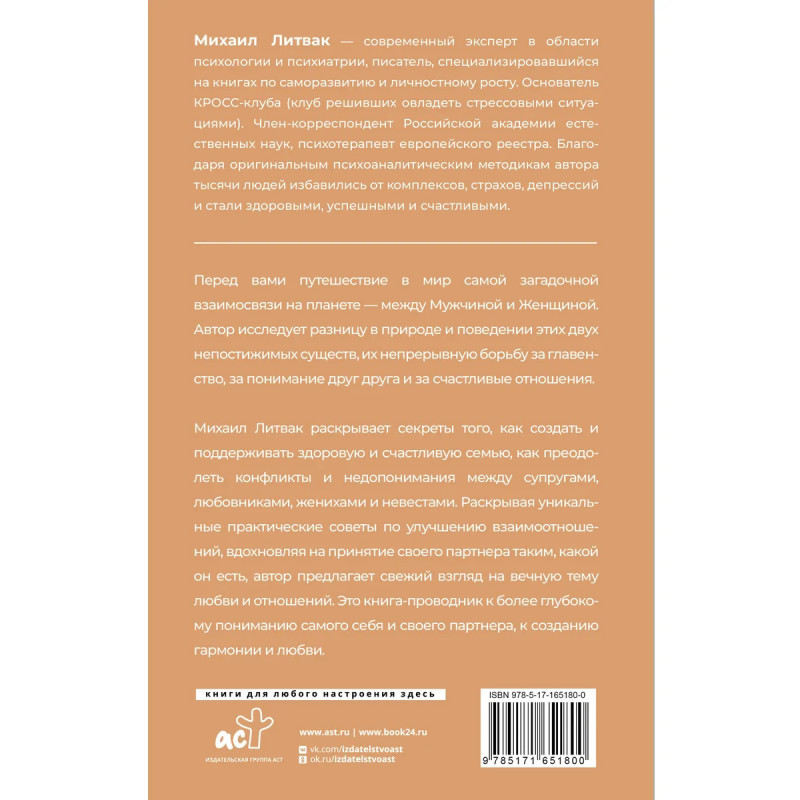 Перед вами путешествие в мир самой загадочной взаимосвязи на планете — между Мужчиной и Женщиной. Автор исследует разницу в природе и поведении этих двух непостижимых существ, их непрерывную борьбу за главенство, за понимание друг друга и за счастливые отношения. Михаил Литвак раскрывает секреты того, как создать и поддерживать здоровую и счастливую семью, как преодолеть конфликты и недопонимания между супругами, любовниками, женихами и невестами. Раскрывая уникальные практические советы по улучшению взаимоотношений, вдохновляя на принятие своего партнера таким, какой он есть, автор предлагает свежий взгляд на вечную тему любви и отношений. Это книга-проводник к более глубокому пониманию самого себя и своего партнера, к созданию гармонии и любви.