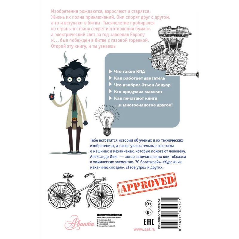 Изобретения рождаются, взрослеют и старятся. Жизнь их полна приключений. Они спорят друг с другом, а то и вступают в битвы. Тысячелетие пробирался из страны в страну секрет изготовления бумаги, а электрический свет за год завоевал Европу и... был побеждён в битве с газовой горелкой. Книга Александра Ивича "Приключения изобретений" познакомит читателя с удивительными машинами и механизмами, которые помогают человеку, а также с изобретателями этих механизмов. Александр Ивич – автор замечательных книг "Сказки о химических элементах. 70 богатырей", "Художник механических дел", "Твое утро" и других. Для среднего школьного возраста.