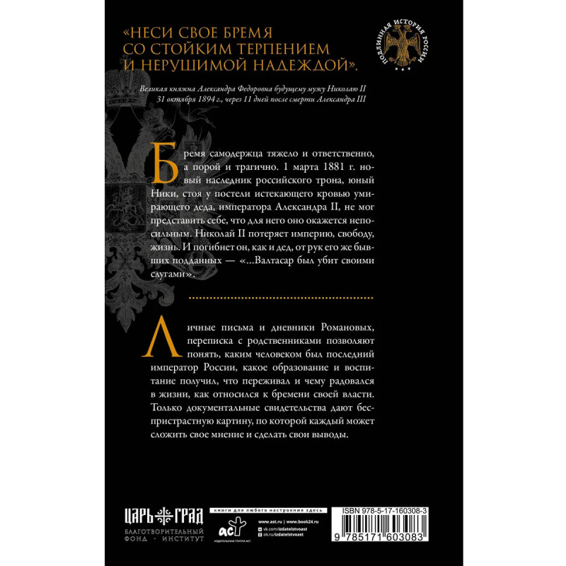 Бремя самодержца тяжело и ответственно, а порой и трагично. 1 марта 1881 г. новый наследник российского трона, юный Ники, стоя у постели истекающего кровью умирающего деда, императора Александра II, не мог представить себе, что для него оно окажется непосильным. Николай II потеряет империю, свободу, жизнь. И погибнет он, как и дед, от рук его же бывших подданных — "…Валтасар был убит своими слугами". Личные письма и дневники Романовых, переписка с родственниками позволяют понять, каким человеком был последний император России, какое образование и воспитание получил, что переживал и чему радовался в жизни, как относился к бремени своей власти. Только документальные свидетельства дают беспристрастную картину, по которой каждый может сложить свое мнение и сделать свои выводы.