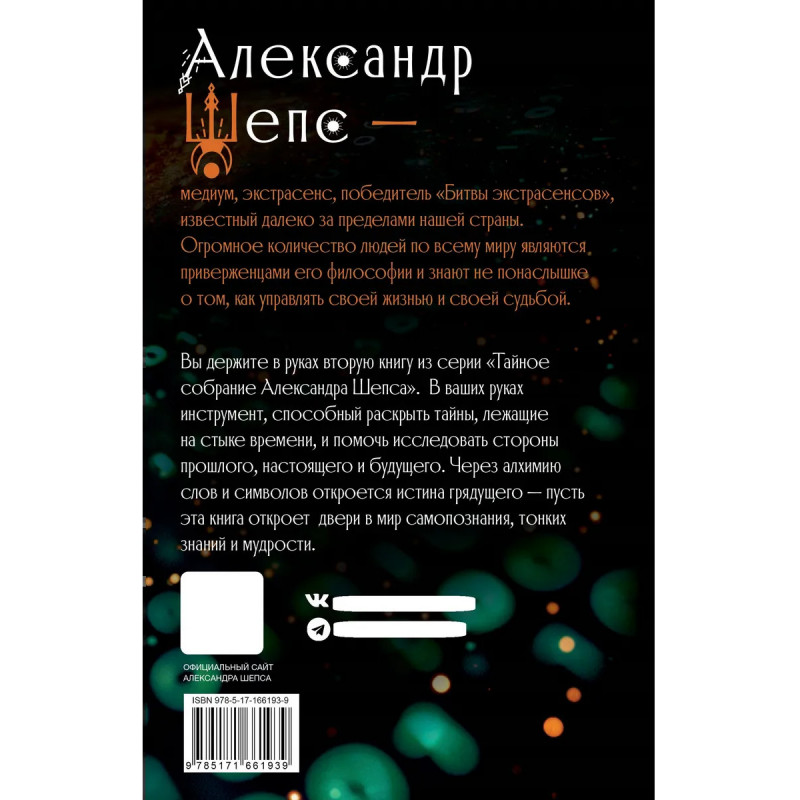 Александр Шепс — медиум, экстрасенс, победитель «Битвы экстрасенсов», известный далеко за пределами нашей страны. Огромное количество людей по всему миру являются приверженцами его философии и знают не понаслышке о том, как управлять своей жизнью и своей судьбой. Вы держите в руках вторую книгу из серии «Тайное собрание Александра Шепса». В ваших руках инструмент, способный раскрыть тайны, лежащие на стыке времени, и помочь исследовать стороны прошлого, настоящего и будущего. Через алхимию слов и символов откроется истина грядущего — пусть эта книга откроет двери в мир самопознания, тонких знаний и мудрости.