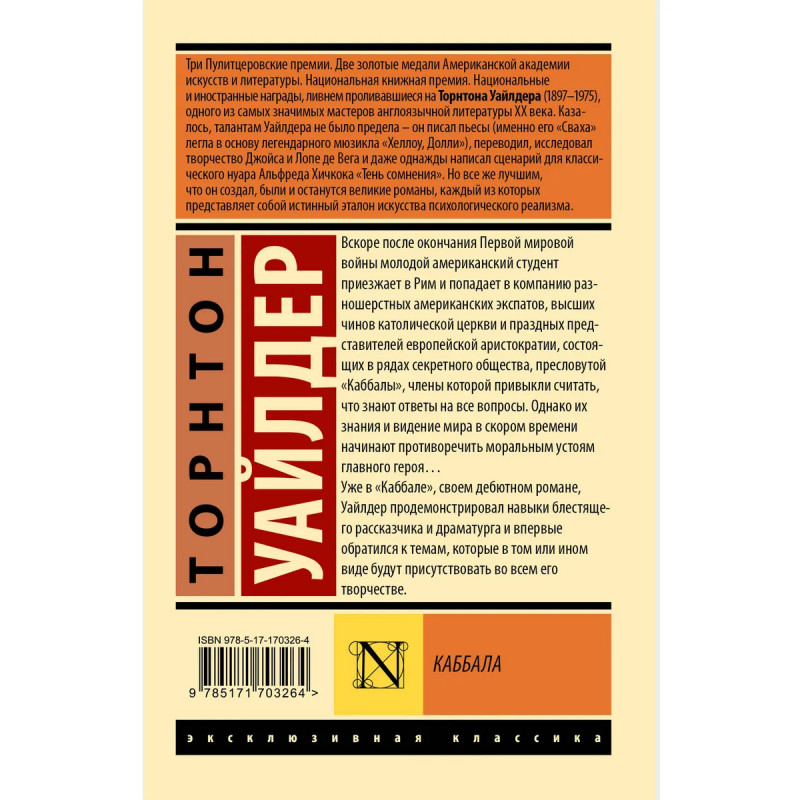 — От автора романов «Мартовские иды» и «Мост короля Людовика Святого». — Писатель, драматург и сценарист Торнтон Уайлдер — трехкратный обладатель Пулитцеровской премии и один из самых значимых американских авторов середины XX века. — Вышедший в 1926 году роман «Каббала» положил начало выдающейся литературной карьере Торнтона Уайлдера. — Уже в своем дебютном романе, Уайлдер продемонстрировал навыки блестящего рассказчика и драматурга и впервые обратился к темам, которые в том или ином виде будут присутствовать во всем его творчестве. — Издание в серии «Эксклюзивная классика» — в удобном карманном формате и узнаваемом оформлении.
