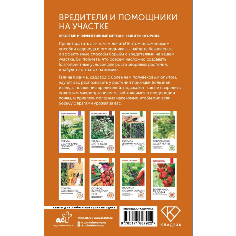 Предотвратить легче, чем лечить! В этом незаменимом пособии садовода и огородника вы найдете безопасные и эффективные способы борьбы с вредителями на вашем участке. Вы поймете, что совсем несложно создавать благоприятные условия для роста здоровых растений, и забудете о тратах на химию. Галина Кизима, садовод с более чем полувековым опытом, научит вас распознавать у растений признаки болезней и следы появления вредителей, подскажет, как не навредить полезным микроорганизмам, заботящимся о плодородии почвы, и привлечь полезных насекомых, чтобы они вели борьбу с врагами урожая за вас.