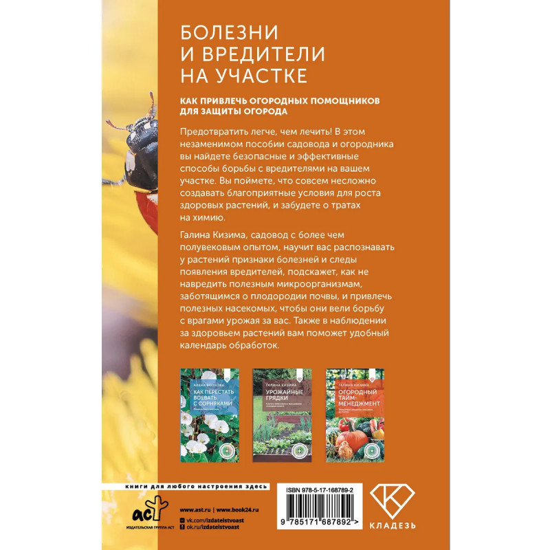 Предотвратить легче, чем лечить! В этом незаменимом пособии садовода и огородника вы найдете безопасные и эффективные способы борьбы с вредителями на вашем участке. Вы поймете, что совсем несложно создавать благоприятные условия для роста здоровых растений, и забудете о тратах на химию. Галина Кизима, садовод с более чем полувековым опытом, научит вас распознавать у растений признаки болезней и следы появления вредителей, подскажет, как не навредить полезным микроорганизмам, заботящимся о плодородии почвы, и привлечь полезных насекомых, чтобы они вели борьбу с врагами урожая за вас.