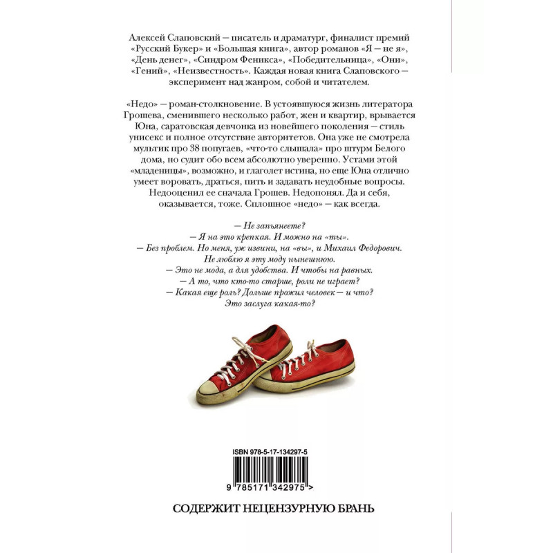 Недо. Алексей Слаповский - писатель и драматург, финалист премий "Русский Букер" и "Большая книга", автор романов "Я - не я", "День денег", "Синдром феникса", "Победительница", "Они", "Гений", "Неизвестность". Каждая новая книга Слаповского - эксперимент над жанром, собой и читателем. "Недо" - роман-столкновение. В устоявшуюся жизнь литератора Грошева, сменившего несколько работ, жен и квартир, врывается Юна, саратовская девчонка из новейшего поколения - стиль унисекс и полное отсутствие авторитетов. Она уже не смотрела мультик про 38 попугаев, "что-то слышала" про штурм Белого дома, но судит обо всем абсолютно уверенно. Устами этой "младеницы", возможно, и глаголет истина, но еще Юна отлично умеет воровать, драться, пить и задавать неудобные вопросы. Недооценил ее сначала Грошев. Недопонял. Да и себя, оказывается, тоже. Сплошное "недо" - как всегда.